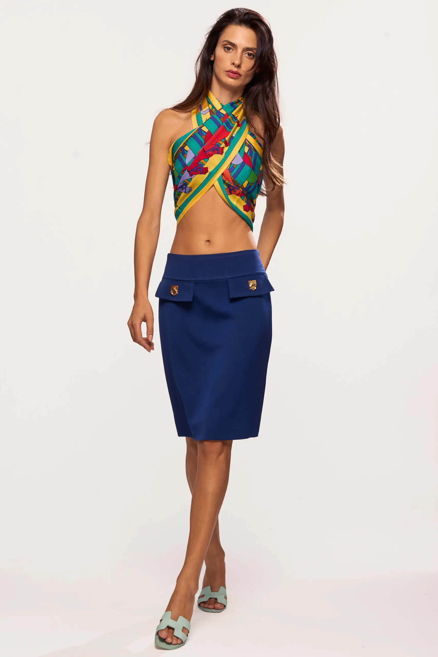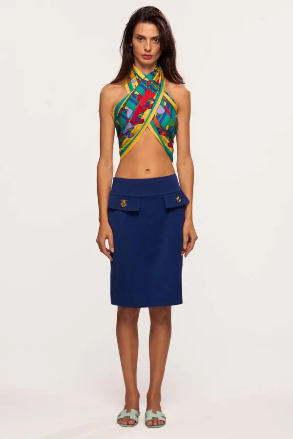 Preloved Celine Straight Skirt embodies the house’s legacy of refined Parisian tailoring. Crafted in France from structured wool, the skirt is cut in a high-waisted, mini silhouette that flatters the figure and adds an effortlessly elegant edge to both casual and formal looks.The rich saphir blue tone serves as a refined neutral, easily paired with blouses, knits, or sharp tailoring. Two front flap pockets are adorned with polished gold-tone Celine logo hardware, offering both function and a discreet signature detail. A concealed zip at the back keeps the finish minimal, while the fully lined interior ensures all-day comfort.