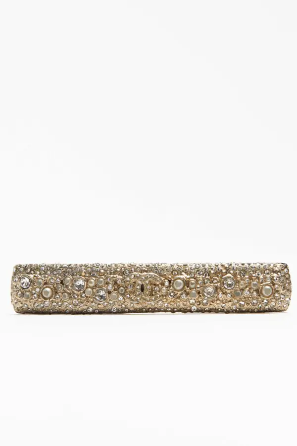 Preloved Chanel Hair Clip Barrette With Crystals and Faux Pearls is a radiant accessory that captures the maison’s timeless balance of elegance and embellishment. Crafted in France, this refined piece showcases a meticulously detailed surface encrusted with glimmering crystals and luminous faux pearls, each one delicately set to enhance the gold-tone metal base. At the center, the iconic interlocking CC logo nestles subtly among the embellishments, offering a discreet yet instantly recognizable symbol of heritage and luxury. The harmonious blend of textures and tones reflects Chanel’s enduring commitment to elevating the everyday with sophistication and artistry. A collector’s item with lasting allure, this Chanel hair accessory is a small work of art, crafted to bring grace and glamour to even the simplest gestures.