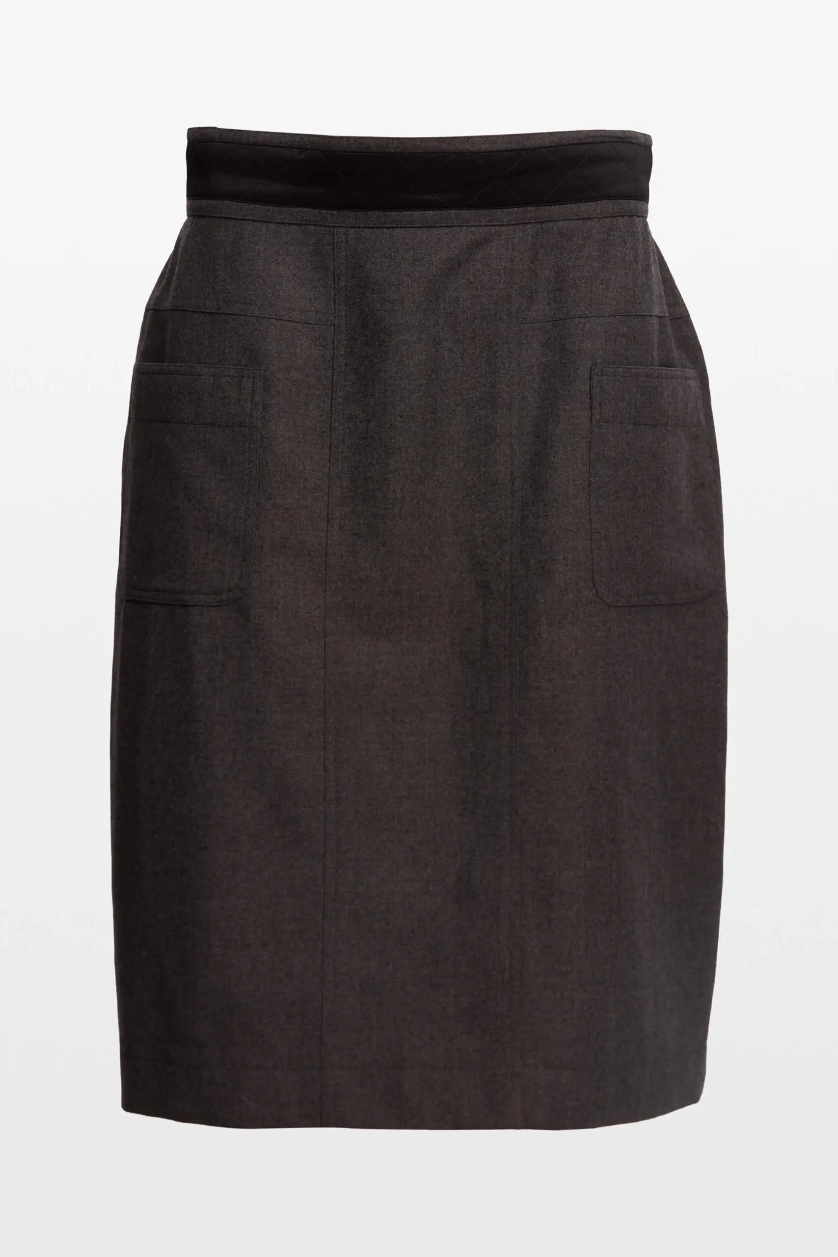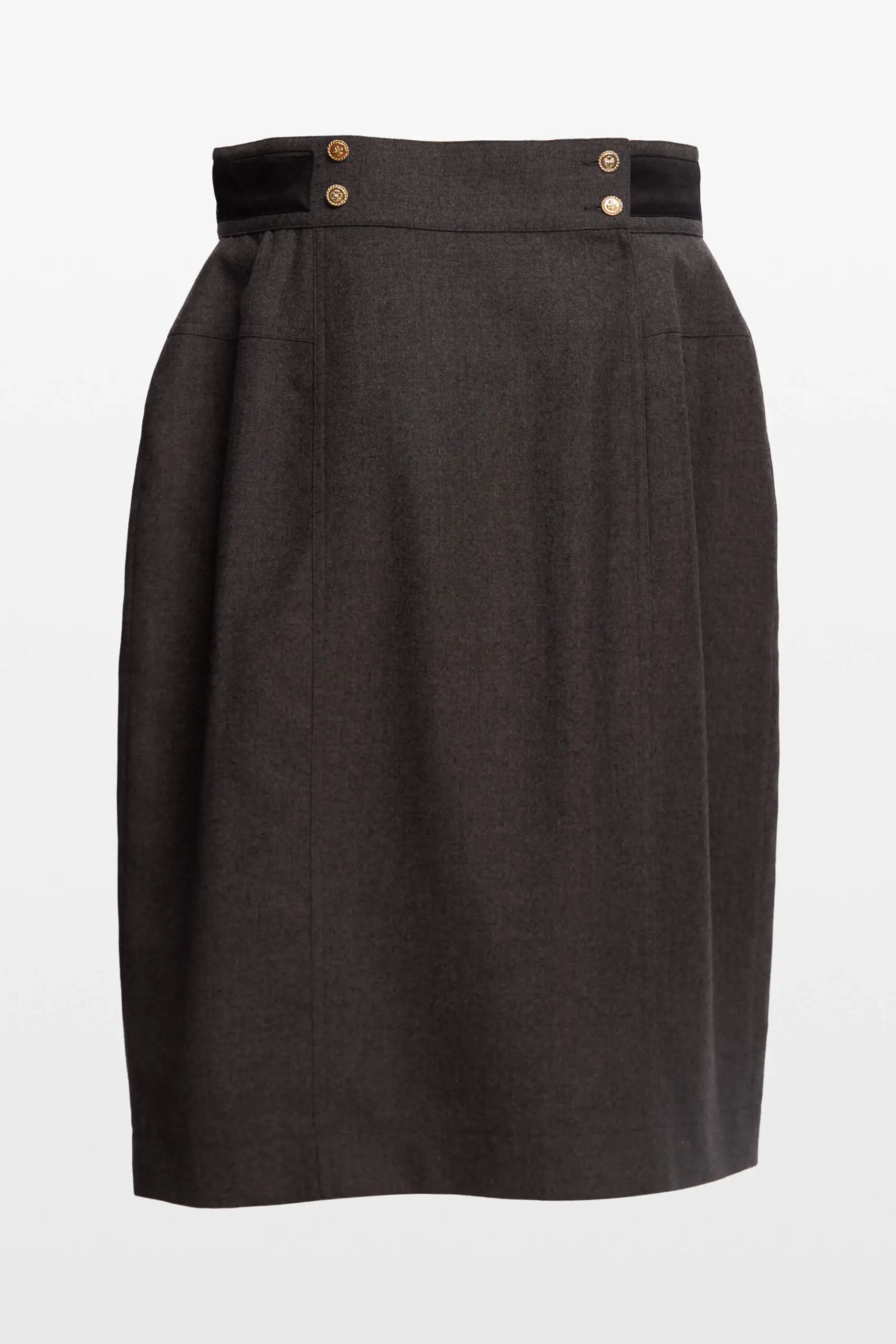 Preloved Chanel Pencil Skirt embodies the House’s enduring approach to design, where refined tailoring meets functional elegance. Crafted from wool, the skirt reflects Chanel’s commitment to material integrity, precision, and longevity. Rendered in a classic grey tone, the design features a structured pencil silhouette that follows the natural line of the body while maintaining a clean, architectural form. The waist is accented with decorative gold-tone metal buttons, detailed with a braided (rope-edge) border and a subtly sculpted central motif, an unmistakable reference to Chanel’s historic dialogue with military and nautical uniform codes. The inclusion of back patch pockets reinforces Gabrielle Chanel’s philosophy of practical elegance, merging utility with sophistication. Clean vertical seams elongate the silhouette and highlight the House’s mastery of proportion and balance.