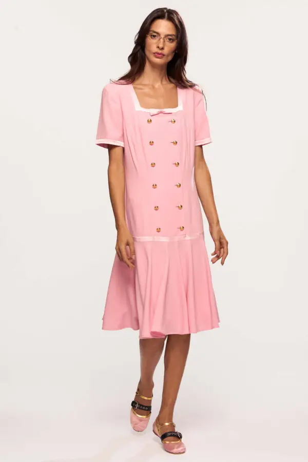 Crafted in a soft lightweight pink wool, the dress features a drop waist design that elongates the torso and creates a fluid, flattering line over the hips. The square neckline is accented with a delicate silk bow and tonal satin trims, offering a gentle contrast in texture. The structured shoulders, subtly enhanced with light padding, reflect Escada’s architectural approach to proportion, while the gold-tone embossed buttons introduce a note of classic opulence.