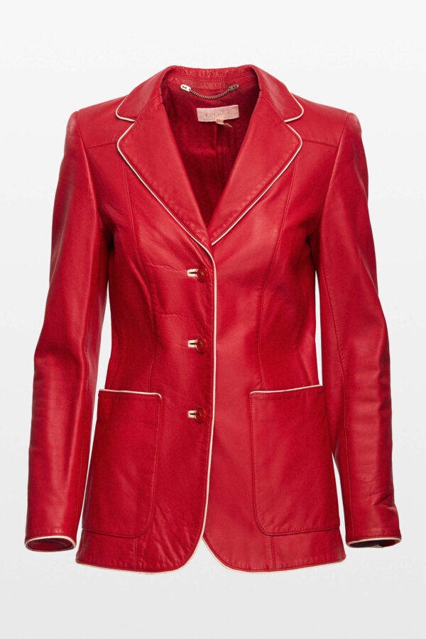Preloved Escada Leather Blazer is a bold statement in timeless tailoring, designed for the woman who commands attention with effortless elegance. Crafted in Germany from supple leather in a vivid red hue, the blazer is impeccably constructed with structured shoulders, classic lapels, and neatly finished seams that contour the silhouette with precision. Contrasted with crisp white piping along the lapel, placket, cuffs, and oversized patch pockets, this piece marries classic craftsmanship with a contemporary twist. The fully lined interior, composed of smooth rayon,ensures comfort while enhancing the garment’s fluid drape and luxurious finish. Escada’s signature lies in its unapologetic use of color and attention to silhouette. A rare find that channels the glamour and empowerment of late 20th-century European fashion, it transitions seamlessly from power meetings to after-hours sophistication.