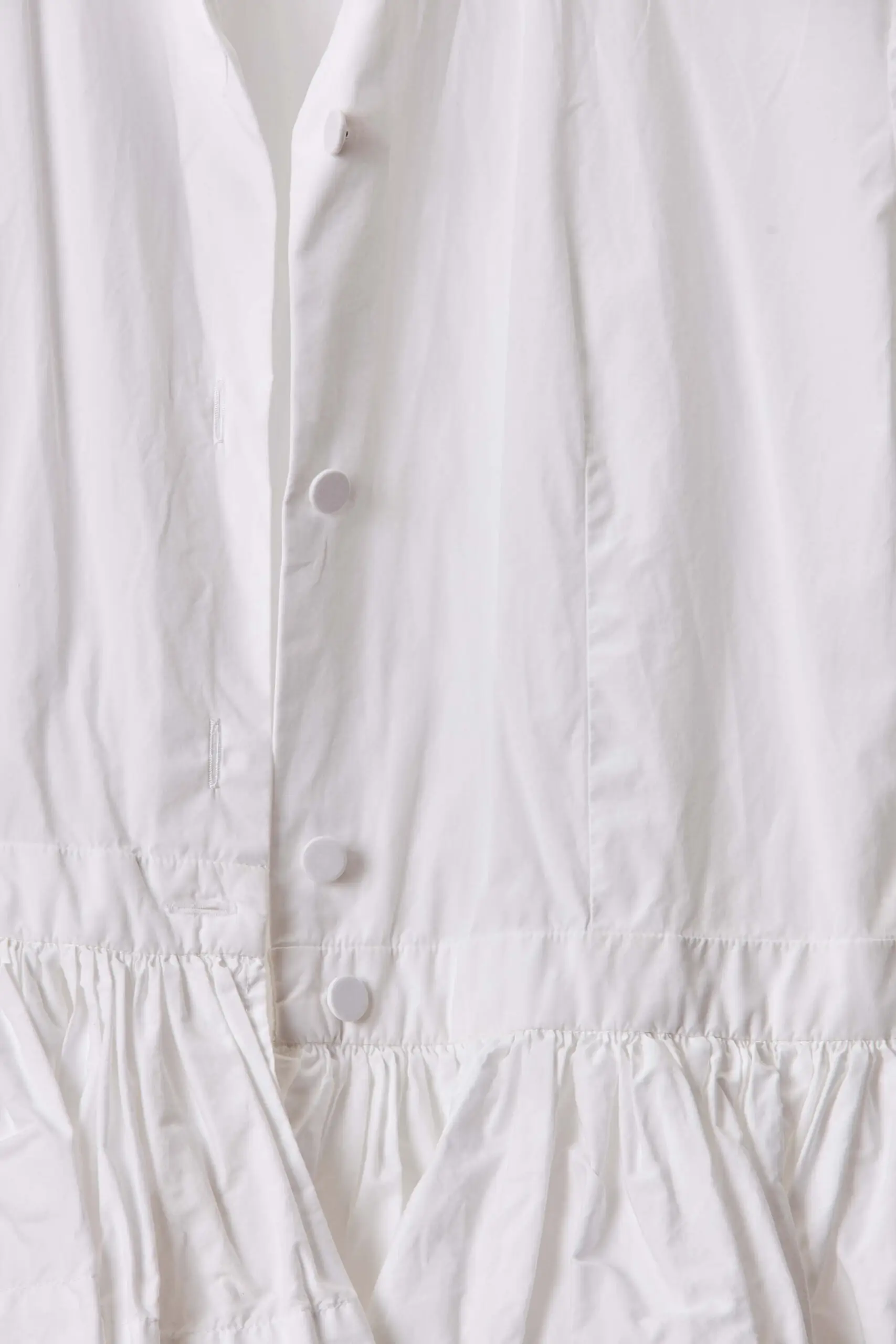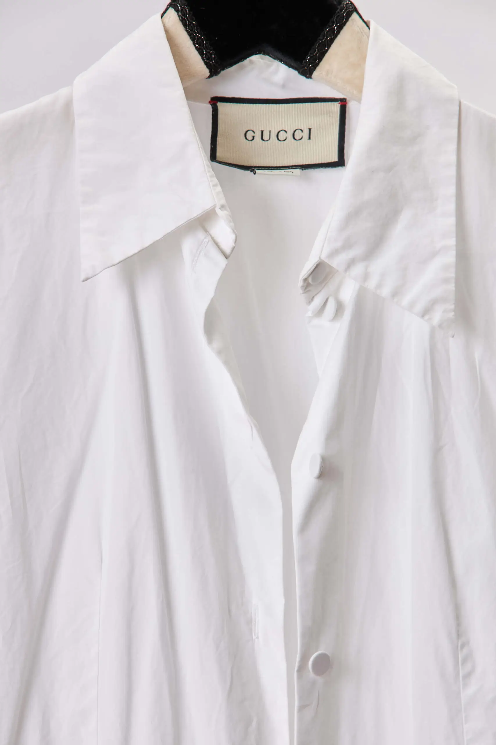 Preloved Gucci Top Peplum Blouse is a beautiful expression of refined femininity, merging the house’s crisp tailoring with soft, sculptural volume. Crafted in Italy from pure white cotton, it features a sharply cut collar and full front button closure, anchored by a gathered peplum hem that adds graceful dimension to the silhouette. The clean, architectural lines of the long sleeves and structured cuffs contrast harmoniously with the soft draping of the lower half, making this an ideal piece for both formal and casual settings. Wear it tucked or untucked, its polished yet playful form offers styling versatility across seasons. Discreetly luxurious, this blouse is a staple for lovers of quiet elegance and timeless design.
