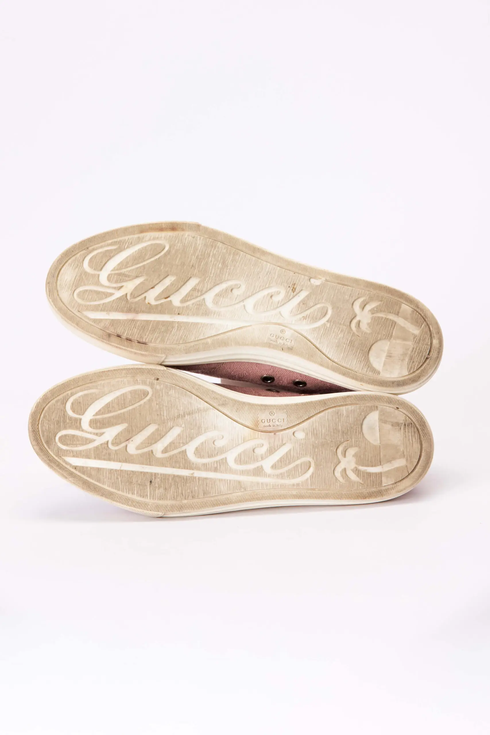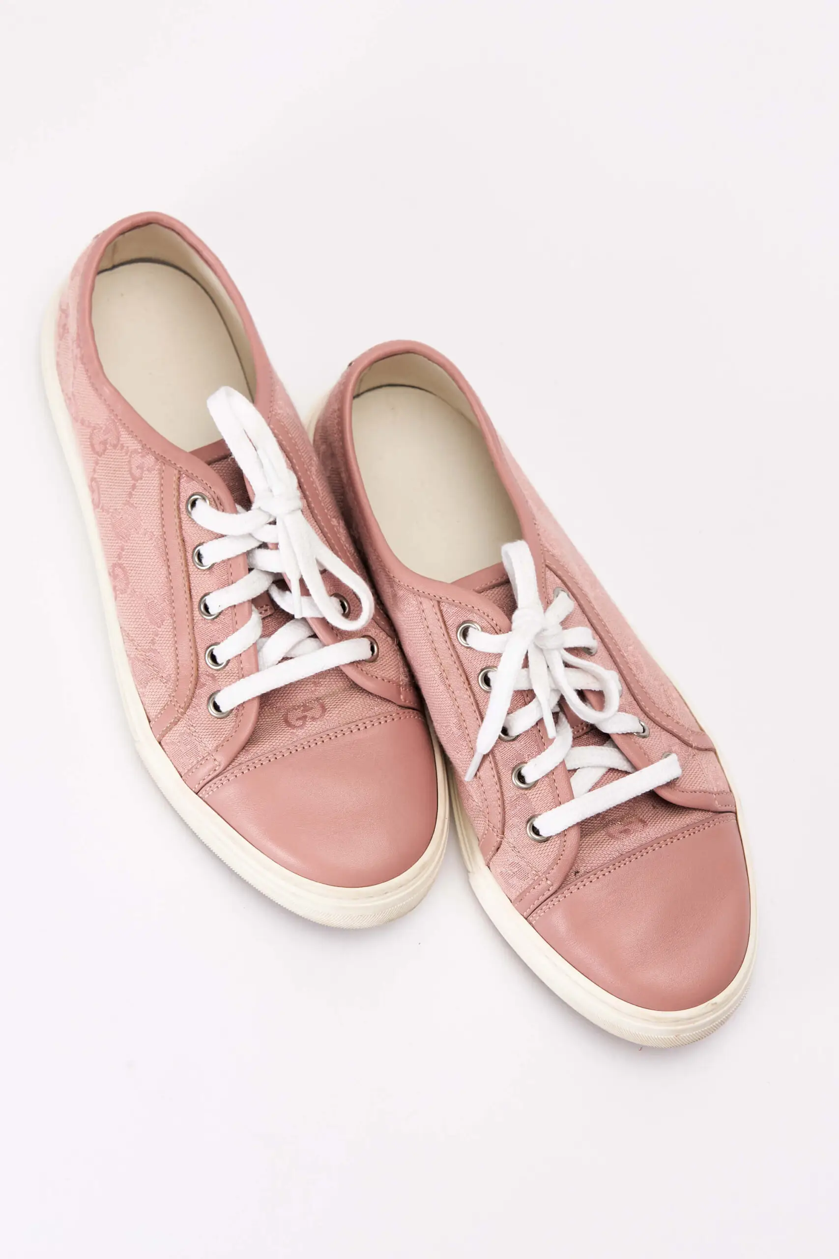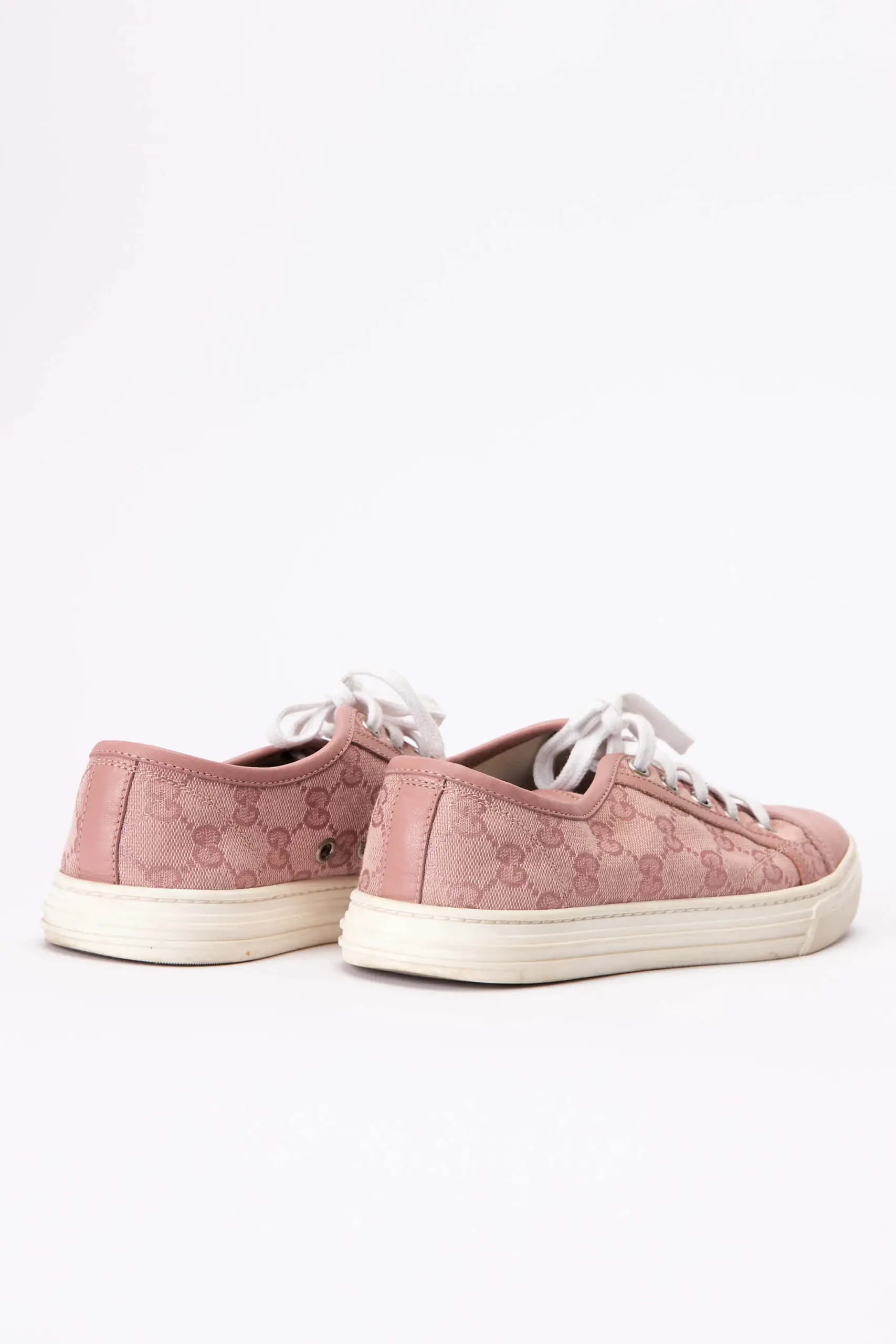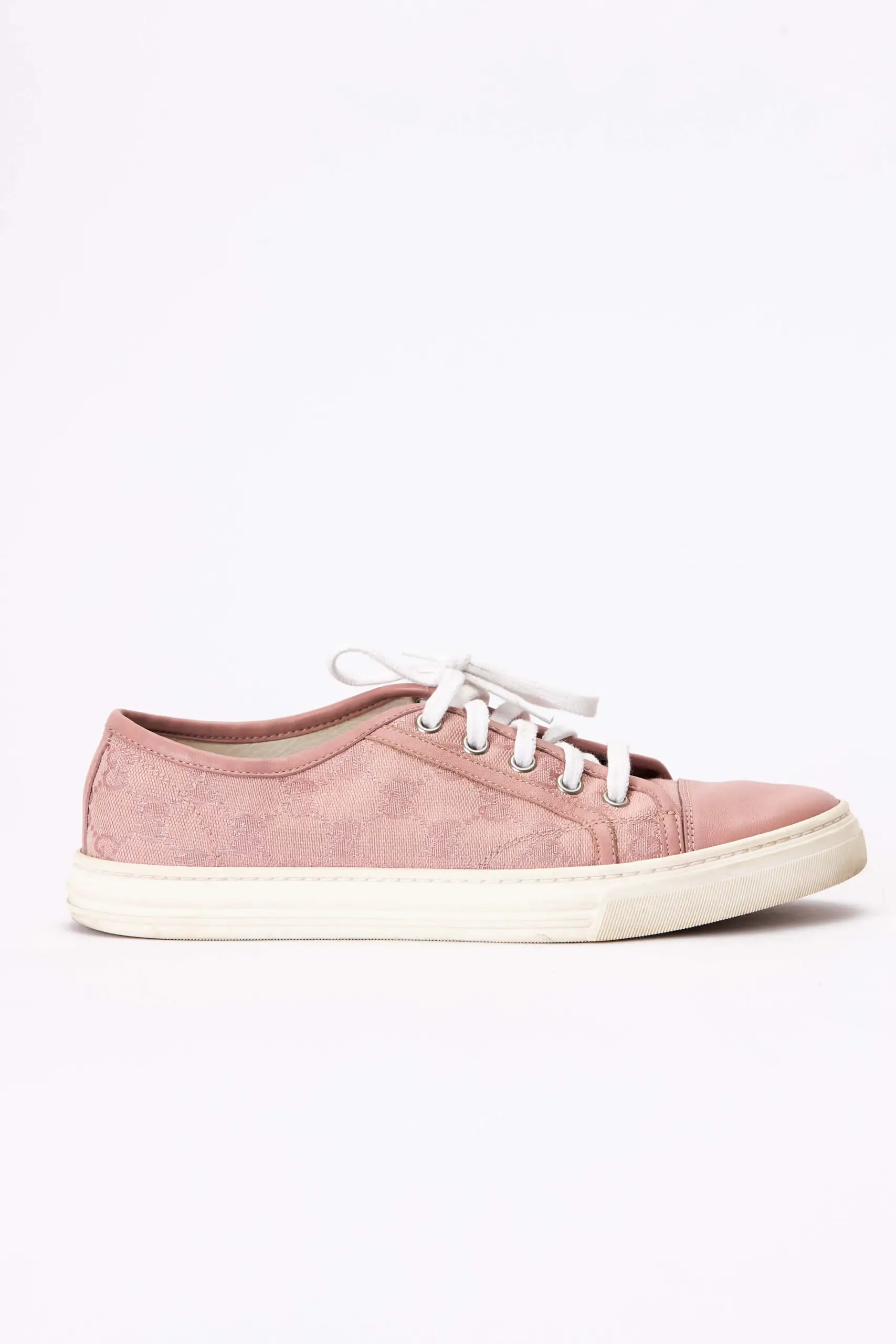 Step into understated luxury with these Gucci GG Canvas Low Top Sneakers in a charming soft pink hue. Crafted in Italy, this pair combines the label’s iconic monogram canvas with tonal leather accents for a subtle contrast of texture and shine. Set on a clean white rubber sole, the round-toe design features a lace-up front, metal eyelets, and a padded leather insole for comfortable day-long wear. The pink-on-pink GG motif adds a stylish edge, while the rubber trim completes the contemporary silhouette. Perfect for adding a fresh, feminine twist to casual outfits, these sneakers bring signature Gucci flair to your everyday wardrobe. Pair them with jeans, shorts, or even a flowy dress for off-duty cool with a designer finish.
