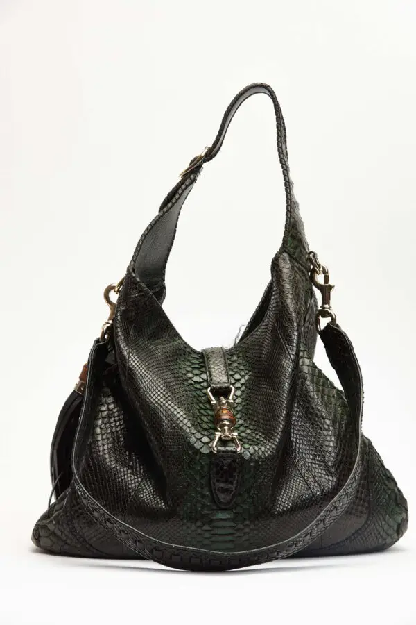 First introduced in the 1960s and later named after Jackie Kennedy, the Jackie bag quickly became a recognizable symbol of effortless style. This version in python leather highlights the natural texture and striking pattern of the material, emphasizing craftsmanship and character. The crescent-shaped hobo design provides a comfortable carry, while the piston clasp adds both visual interest and secure functionality. Reimagined during Tom Ford’s era at Gucci, the Jackie continues to adapt and stay relevant across decades. Its balance of classic form and modern details makes it a smart choice for collectors and everyday use alike. This bag is designed to accompany you seamlessly, whether in casual settings or more formal occasions.