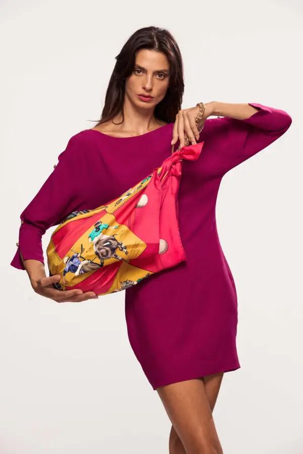 The exterior shows light signs of wear consistent with normal use, with a few small stains visible in certain areas. These marks are minor and not easily noticeable. There are no holes present. The edges and hems are intact and well maintained, with no fraying. The silk fabric remains in good overall condition, with no tears, holes, or pulled threads. The color and print are vibrant and visually pleasing, with no fading or damage. The stitching is intact and undamaged. The brand name is incorporated into the print design. The composition and brand tags are not present on this item.