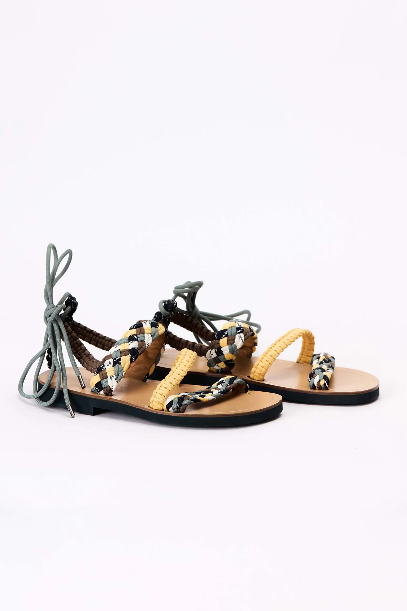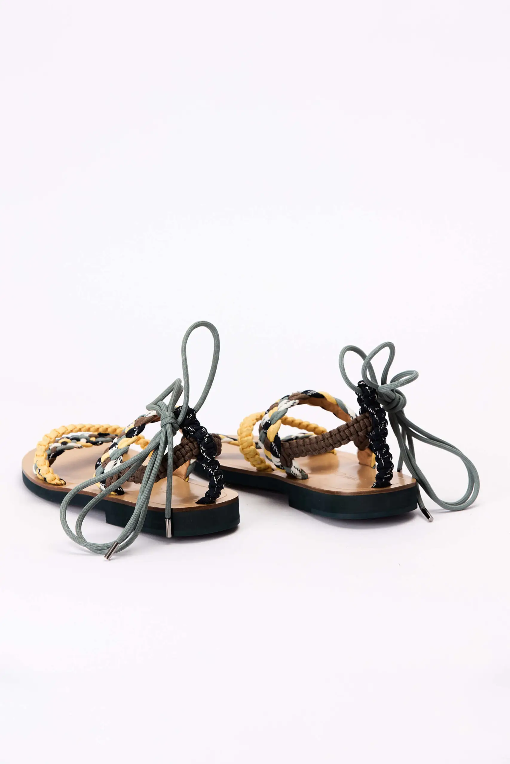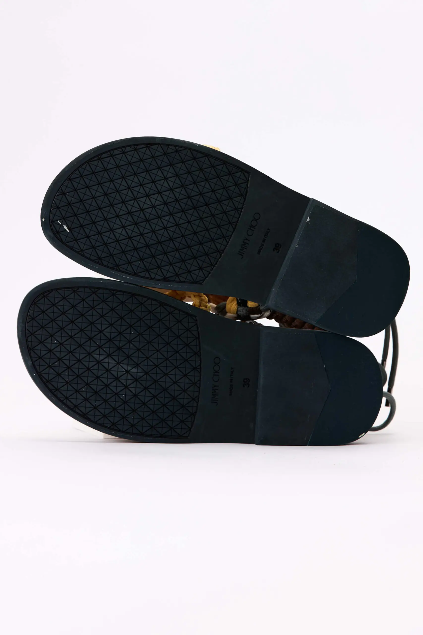 The Jimmy Choo Asta Gladiator Sandals reimagine a timeless classic through a playful and colorful lens. Crafted in Italy, these sandals feature multicolored braided nylon straps in an intricate weave of blue, yellow, brown, and ivory tones, bringing an artisanal spirit to a modern silhouette. Designed with versatility and vacation ready style in mind, the Asta boasts a three strap construction, including a practical ankle tie fastening that ensures secure wear while adding a casual chic edge. The flat sole in a contrasting dark rubber finish offers comfort and durability, making them ideal for both city walks and beach escapes. Whether you’re styling them with a maxi dress or cropped trousers, the Asta sandals lend a burst of texture, color, and craftsmanship to any warm weather outfit.