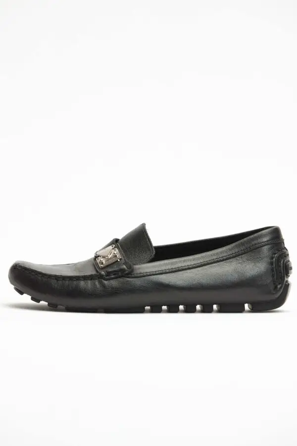 Preloved Louis Vuitton Suhali Lombok Driving Loafers embody understated luxury and everyday elegance. Expertly made in Italy from supple black Suhali leather, they’re designed to offer both comfort and effortless style. The signature S-lock hardware in silver tone adds a distinctive branded touch to the sleek upper, while the pebbled leather texture gives character to the design. Built on a durable rubber driving sole, these slip-on loafers offer flexibility and grip ideal for day-to-day city wear or travel. The leather-lined insole provides cushioning and support, though it has been professionally replaced in the back area due to prior wear.