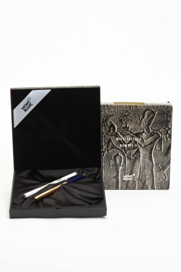 Meisterstück Ramses II rollerball pen is part of Montblanc’s prestigious series honoring great figures of history, conceived as a tribute to Ramses II, one of the most powerful and enduring rulers of ancient Egypt. The pen is crafted from a rich, deep blue lapis lazuli, the sacred stone of the pharaohs, historically associated with divine power, eternity, and protection. Gold-tone accents enhance the design, referencing the opulence and symbolic splendor of ancient Egyptian art and royal regalia. The harmonious contrast between the luminous blue body and the warm metallic details reflects Montblanc’s mastery of materials and proportion. Produced within the iconic Meisterstück line, this writing instrument exemplifies Montblanc’s dedication to precision engineering, refined aesthetics, and cultural storytelling. The Ramses II model stands out for its historical narrative and elegant presence, making it highly desirable among collectors of luxury writing instruments and admirers of classical civilizations. Both functional and collectible, the Montblanc Ramses II rollerball pen is suitable for daily refined use or as a distinguished addition to a curated collection. Pieces from this thematic series are particularly sought after on the secondary market, especially when preserved with their original presentation box and documentation. A timeless expression of luxury, history, and craftsmanship, this pen represents Montblanc’s ability to transform writing instruments into objects of cultural significance.